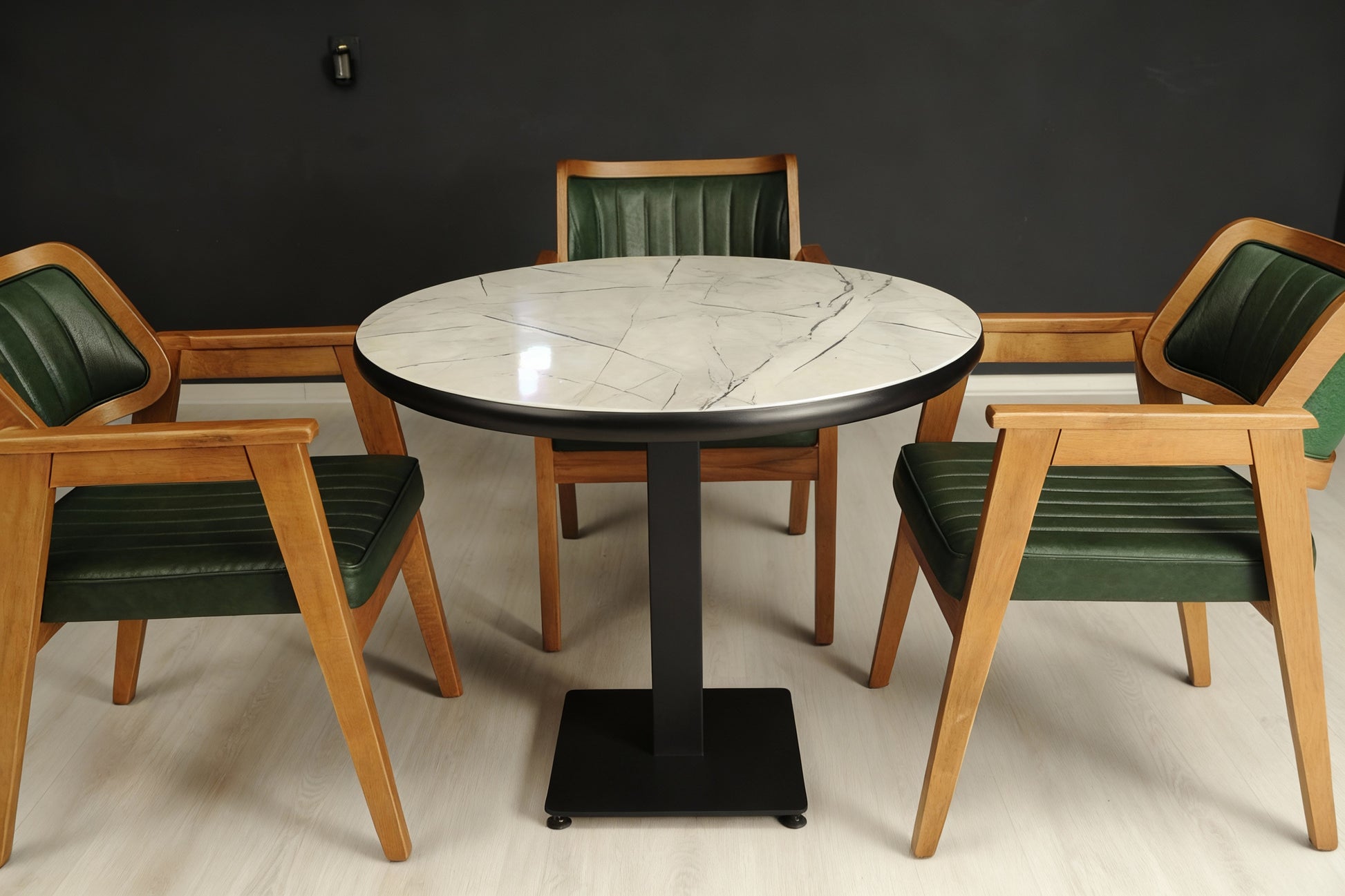 Избор от тип крак - кръгъл от габърова дървесина в цвят подхождащ на плота, или метален единичен/метален октопод.